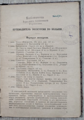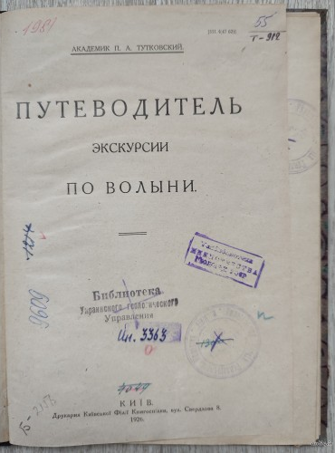 Описание: Тутковский П. Путеводитель экскурсии по Волыни. Друкарня Київської філії книгоспілки. Київ. 23 сторінки + 8 таблиць. 15 см/21.5 см Наклад 1000 примірників. Павло Аполлонович Тутковський (1858 — 1930) — український геолог, географ і педагог. Один з основоположників геології й географії України, дійсний член Української (з 1918 року) і Білоруської (з 1928 року) академій наук та Наукового товариства імені Шевченка (з 1923 року).