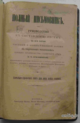Описание: Полный письмовник. Руководство к составлению писем на все случаи частной и общественной жизни с подробным объяснением порядка производства судебных дел и с приложением вексельного устава; положения о найме сельских рабочих; устава о наказаниях налагаемых мировыми судьями и проч. Настольно-справочная книга для лиц всех сословий. Типография Вильде. Москва. 328+7 страниц. 15 см/22.5 см Карандаш на титульном листе (на фото). В современном полу кожаном переплете.